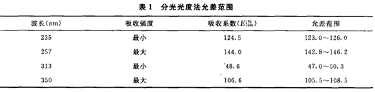 精密稱取在120℃干燥至恒重的基準(zhǔn)重鉻酸鉀約60mg,置1000m1量瓶中,用0.005mo1L硫酸液溶解并稀釋至1000m1,用配對(duì)的1 cm石英池,以0.005mo1L硫酸液為空白,在235,257,313,350nm分別測定吸光度,然后換算成E,測得值應(yīng)符合表1中規(guī)定的允差范圍。