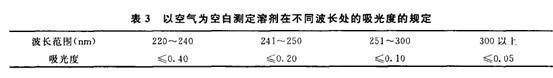 4.含有雜原子的有機(jī)溶劑,通常均具有很強(qiáng)的末端吸收。因此,當(dāng)作溶劑使用時(shí),它們的使用范圍均不能小于截止使用波長。例如甲醇、乙醇的截止使用波長為205nm。另外,當(dāng)溶劑不純時(shí),也可能增加干擾吸收。因此,在檢查所用的溶劑在供試品所用的波長附近是否符合要求,即將溶劑置1 cm石英吸收池中,以空氣為空白(即空白光路中不置任何物質(zhì))測定其吸光度,溶劑和吸收池的吸光度應(yīng)符合表3規(guī)定。