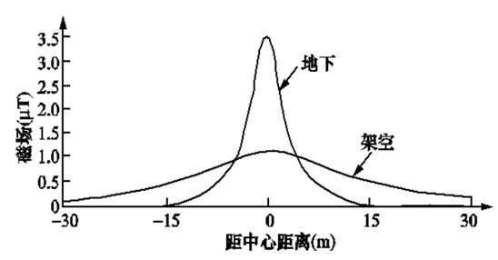 圖4 66kV架空線與地下電纜產生的地面(1m高度)磁場
