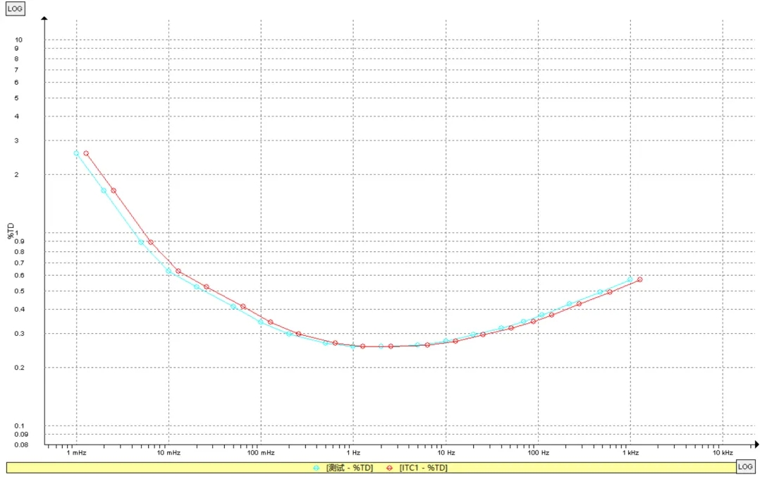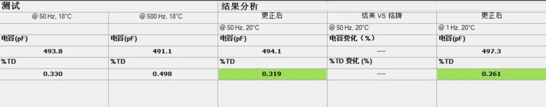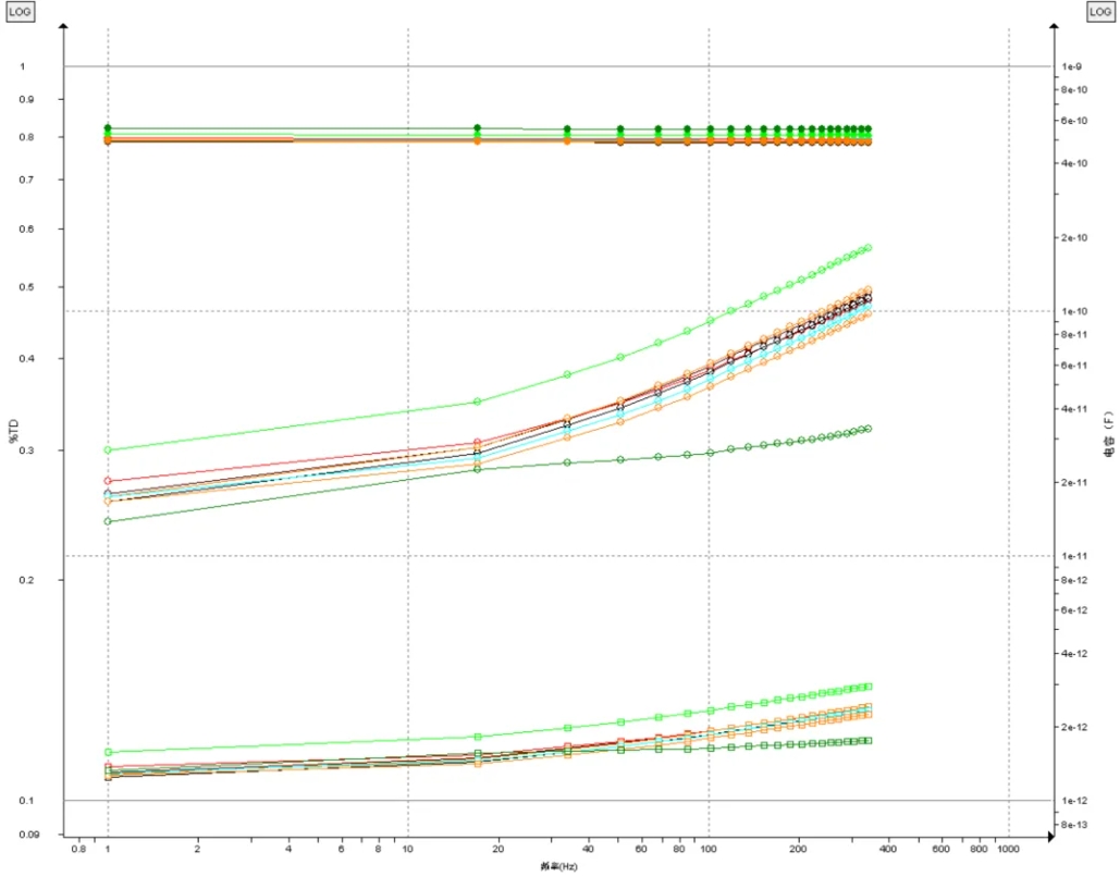 介質(zhì)譜分析測試的是各個不同頻率下的電容值和介損值,并繪制成電容和介損的頻率曲線。介質(zhì)譜曲線能夠更為清晰地反映絕緣的狀態(tài),并且有助于判斷測試結(jié)果是否存在異常。介損隨頻率改變,從左到右頻率逐次增大。可以看到,測試結(jié)果曲線與模型曲線十分平滑且基本一致。模型曲線與測試曲線有偏移的原因是溫度不同。
